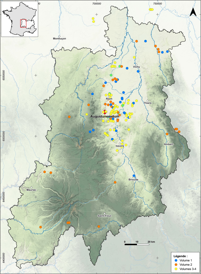 Au moins quatre volumes sont prévus pour publiés les habitats sélectionnés (fig. 2). Le tapuscrit du premier vient d’être rendu au comité éditorial de la collection Terra Mater, éditée par les Presses Universitaires de l’université de Clermont. Il présente 26 notices, une bibliographie générale et un grand chapitre introduisant le cadre de l’étude et du territoire, la méthodologie et les premiers résultats. Les thématiques abordées concernent la présentation des formes de l’habitat, l’exploitation de la campagne, l’artisanat, le commerce et la société.